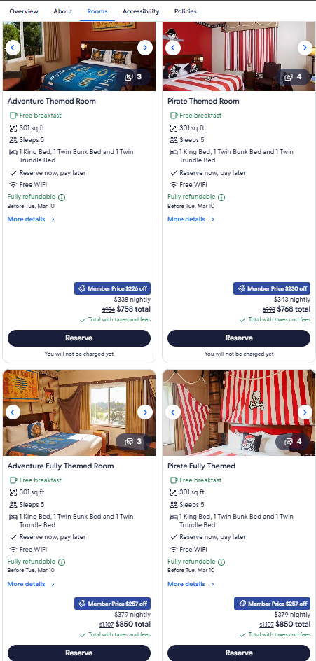 As you can see below, fully themed rooms are under $100 more expensive, but don’t look all that different. They are the same size.