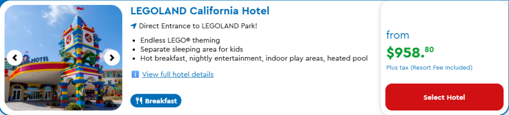 Hotels.com is the clear price winner here. Cheaper than the official Legoland website by $200 – which is $100 per night!
