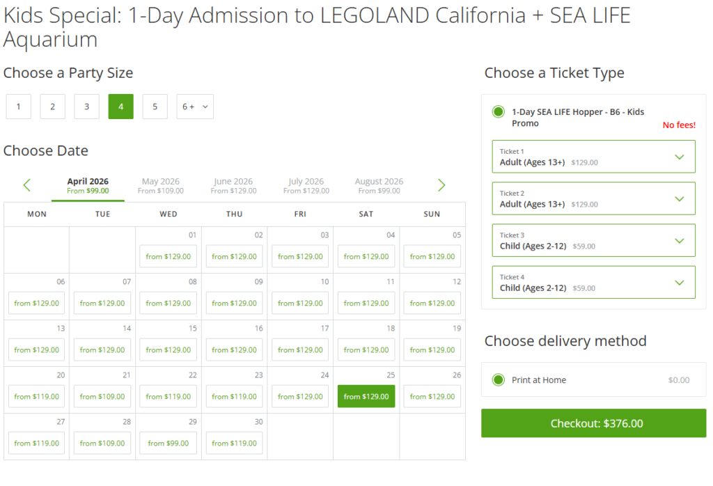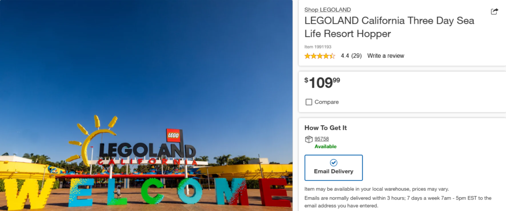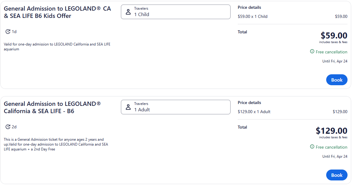 There are so many options on this listing that it took me a long time to click on each option and compare the prices. There were only 1 day options for the kids, which happened to be the same prices as Legoland’s official site. However, I was able to find the 2 day deals for the Adults.