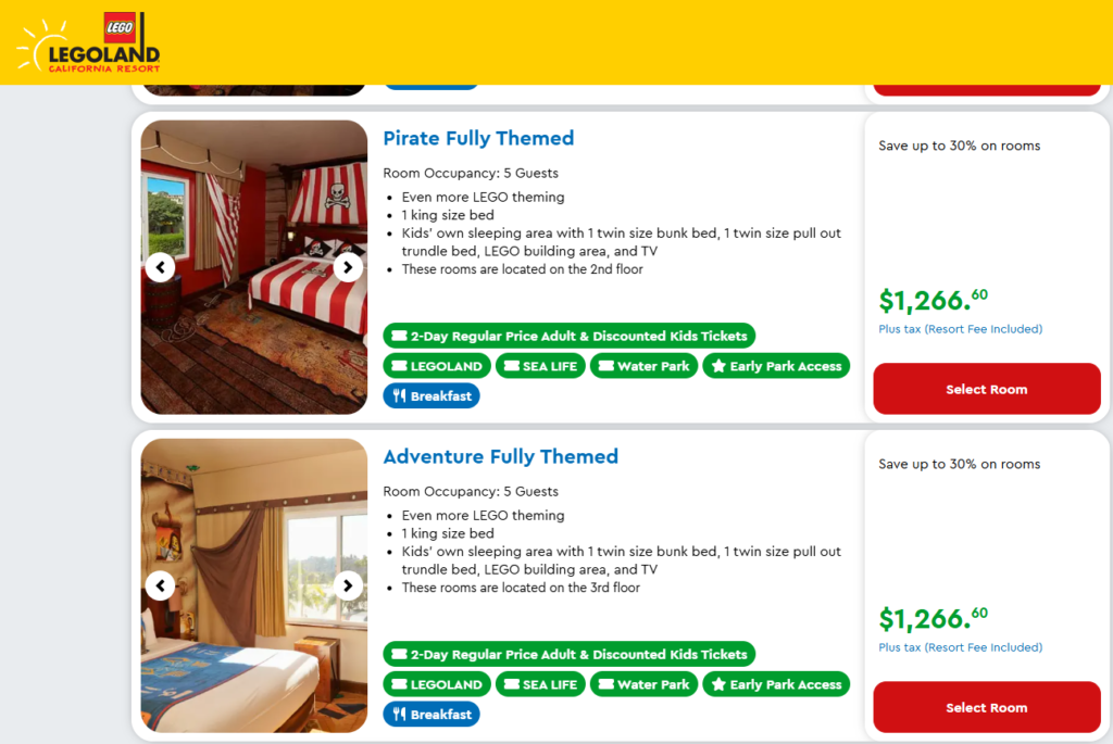However, if you want the specialty themed rooms, you will need to call Legoland to see if you can book with hotels.com then upgrade directly with them!